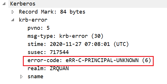 cname, PrincipalName 类型 在 AS_REQ 里面 cname 是请求的用户, 这个用户名存在和不存在, 返回的包有差异, 可以 用于枚举域内用户名。用户名错误