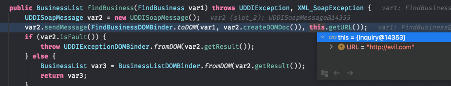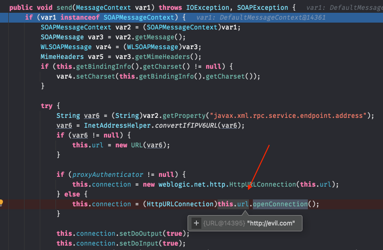 ...这时 Binding 的 url 属性已经被我们控制,继续执行 UDDISoapMessage#sendMessage 触发 ssrf 请求: